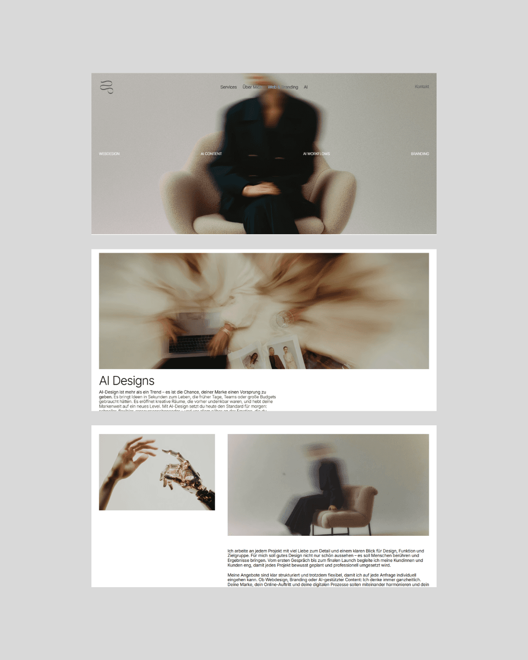 Ich entwickle strategische Websites für Dienstleisterinnen, die klar führen, Vertrauen aufbauen und Buchungen leichter machen und erstelle KI-Visuals & Content für Produkte, die deine Marke modern und hochwertig zeigen.